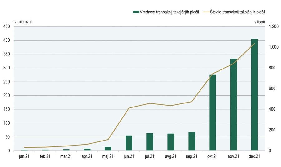 Leto 2021 pa je zaznamovala uveljavitev takojšnjih plačil, saj se uporaba v Sloveniji močno povečuje. Lansko leto je čezmejno zagotavljanje takojšnjih plačil ponudilo še devet bank in hranilnic (do konca leta skupaj že 11), ki delujejo na območju Slovenije, v plačilni sistem za takojšnja plačila znotraj države pa so vse vključene že od leta 2020. Takojšnja plačila so tista, pri katerih prejemnik sredstva na svoj račun prejme takoj ali skoraj takoj po tem, ko plačilo odredi plačnik. Uporabnikom so na voljo 24 ur, vse dni v letu. Povprečna vrednost takojšnjega plačila je v letu 2021 znašala 289 evra.
