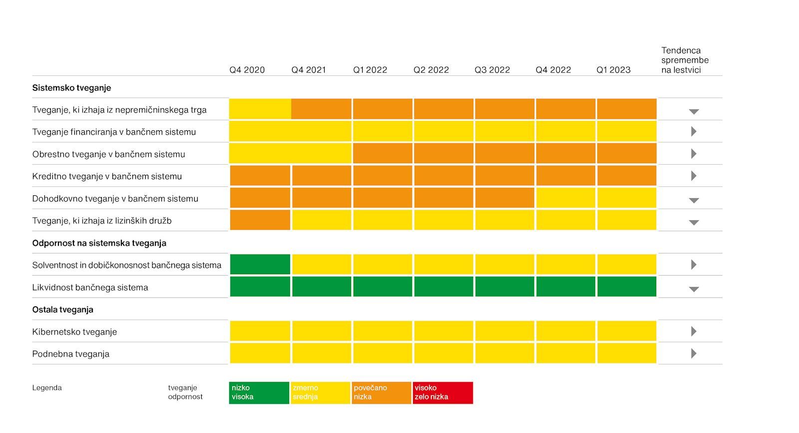 Anketni kazalniki za gospodarstvi Slovenije in evrskega območja so na začetku leta nakazovali ugodnejše gospodarske razmere v primerjavi z lanskim zadnjim četrtletjem in boljše prihodnje obete. Zaradi hitre dinamike sprememb, ki v zadnjem obdobju krepijo negotovost, pa v Banki Slovenije ocenjujemo kot povišana naslednja tveganja: (i) obrestno tveganje, (ii) kreditno tveganje in (iii) tveganje, povezano s trgom nepremičnin. Ob tem odpornost bančnega sistema na morebitno uresničitev tveganj ostaja robustna – v segmentu solventnosti in dobičkonosnosti je ocenjena kot srednja, v segmentu likvidnosti pa visoka.