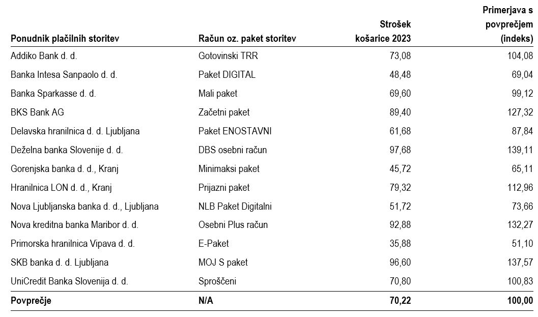 Za tipičnega komitenta je povprečni letni strošek oblikovane košarice storitev za pakete, ki so namenjeni večini komitentov, znašal 70,22 evra (leta 2020 70,47 evra, leta 2021 69,40 evra, leta 2022 70,71 evra).