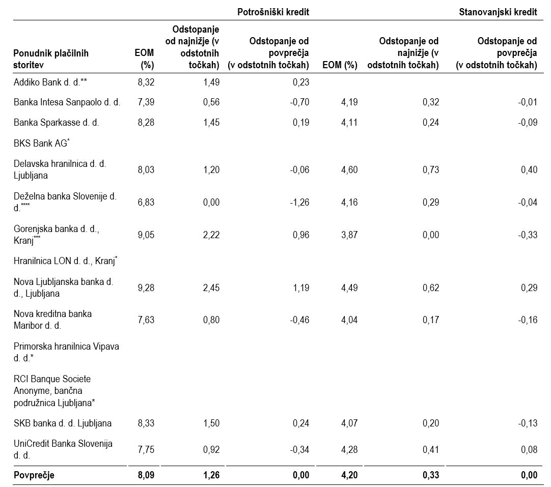 Pri potrošniškem kreditu povprečna tako izračunana EOM znaša 8,09 % (lani 7,90 %), razpon med ponudbo najcenejše in najdražje banke pa je od 6,83 % do 9,28 %, kar v stroških financiranja znaša nekaj več kot 700 evrov (lani nekoliko manj kot 1.000 evrov). Pri stanovanjskem kreditu pa je povprečna s spletnimi kalkulatorji izračunana EOM 4,20 % (lani 4,45 %), razpon med najcenejšo in najdražjo ponudbo pa je od 3,87 % do 4,60 %, kar v stroških financiranja znaša okoli 5.500 evrov (lani okoli 3.000 evrov).