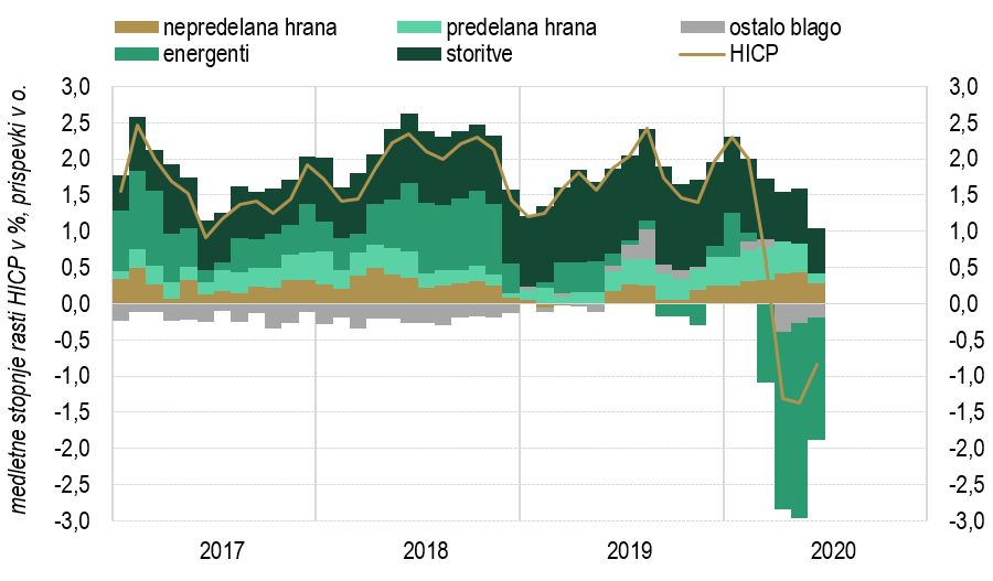 Medletno padanje cen življenjskih potrebščin se je s sproščanjem ukrepov za preprečevanje širjenja koronavirusa nekoliko upočasnilo. Junija je padec cen znašal 0,8 %, kar je za 0,6 odstotne točke manj kot maja. Manjši upad je predvsem posledica gibanja cen elektrike. Te so se junija – ob prenehanju veljavnosti vladnega odloka, ki je cene električne energije za gospodinjske in male poslovne odjemalce znižal za obdobje med marcem in majem – vrnile na prejšnjo raven, kar je statistika zaznala kot povišanje cen za 40 %. K padanju cen so medtem še naprej največ prispevale nizke cene naftnih derivatov; maloprodajne cene Vlada RS ob ponovni rasti svetovnih cen nafte z zniževanjem trošarin še naprej vzdržuje pri enem evru za liter. Junija se je na 2 % znižala tudi rast cen hrane, ki je med epidemijo ob ovirah v trgovinski menjavi pospešila predvsem zaradi dražjega sadja.