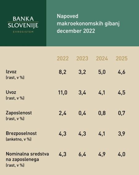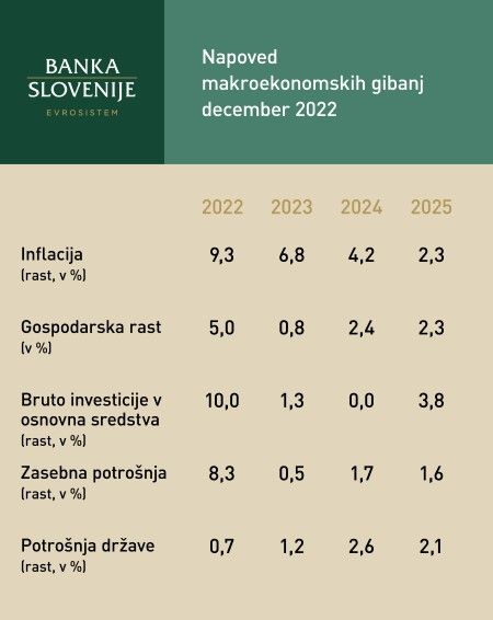 Po močnem popandemskem okrevanju bo gospodarska rast v letošnjem letu ostala visoka pri 5 %. V prihodnjem letu predvsem zaradi pričakovane občutno nižje rasti zasebne potrošnje in upada zasebnih investicij pričakujemo umiritev gospodarske rasti na 0,8 %. Ta se bo ob predvideni stabilizaciji razmer v letih 2024 in 2025 ponovno okrepila in presegla 2 %. Dinamika gospodarske aktivnosti se bo odrazila tudi na trgu dela. V Banki Slovenije v danes objavljeni napovedi gospodarskih gibanj pričakujemo tudi, da bo rast cen v letih 2023 in 2024 zlasti zaradi višjih prispevkov osnovne inflacije in rasti cen hrane vztrajala krepko nad našim inflacijskim ciljem, v letu 2025 pa naj bi se mu približala.