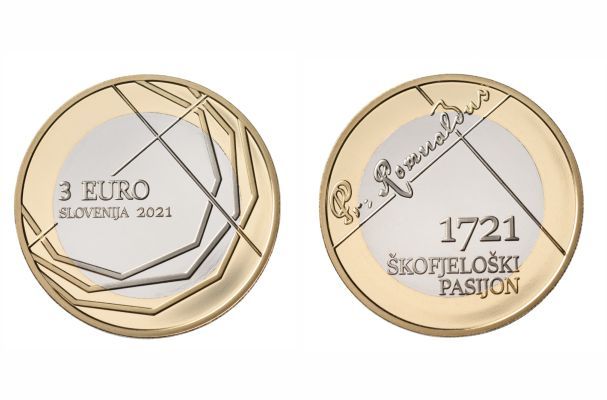 Osrednji motiv zbirateljskih kovancev ob 300. obletnici Škofjeloškega pasijona je križ, katerega stičišče premic predstavlja center dogajanja – ulice Škofje Loke. Okoli križa na sprednji strani tri lomljene črte ne predstavljajo le avditorija, ampak tudi trnovo krono. Vsako izmed 13 oglišč krone predstavlja eno izmed slik Škofjeloškega pasijona. Avtor likovne rešitve kovancev je Matej Štanta.