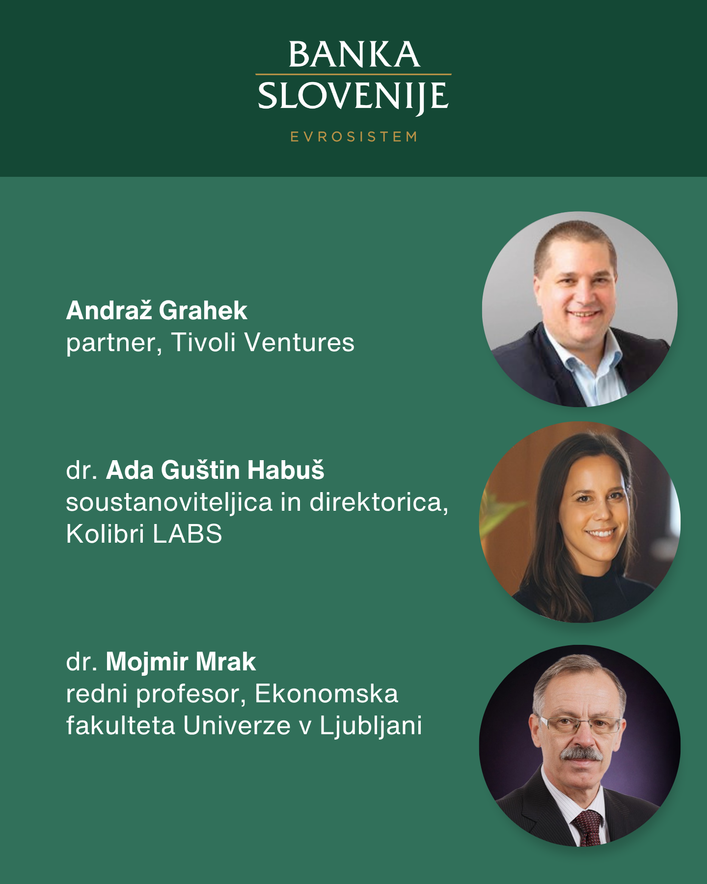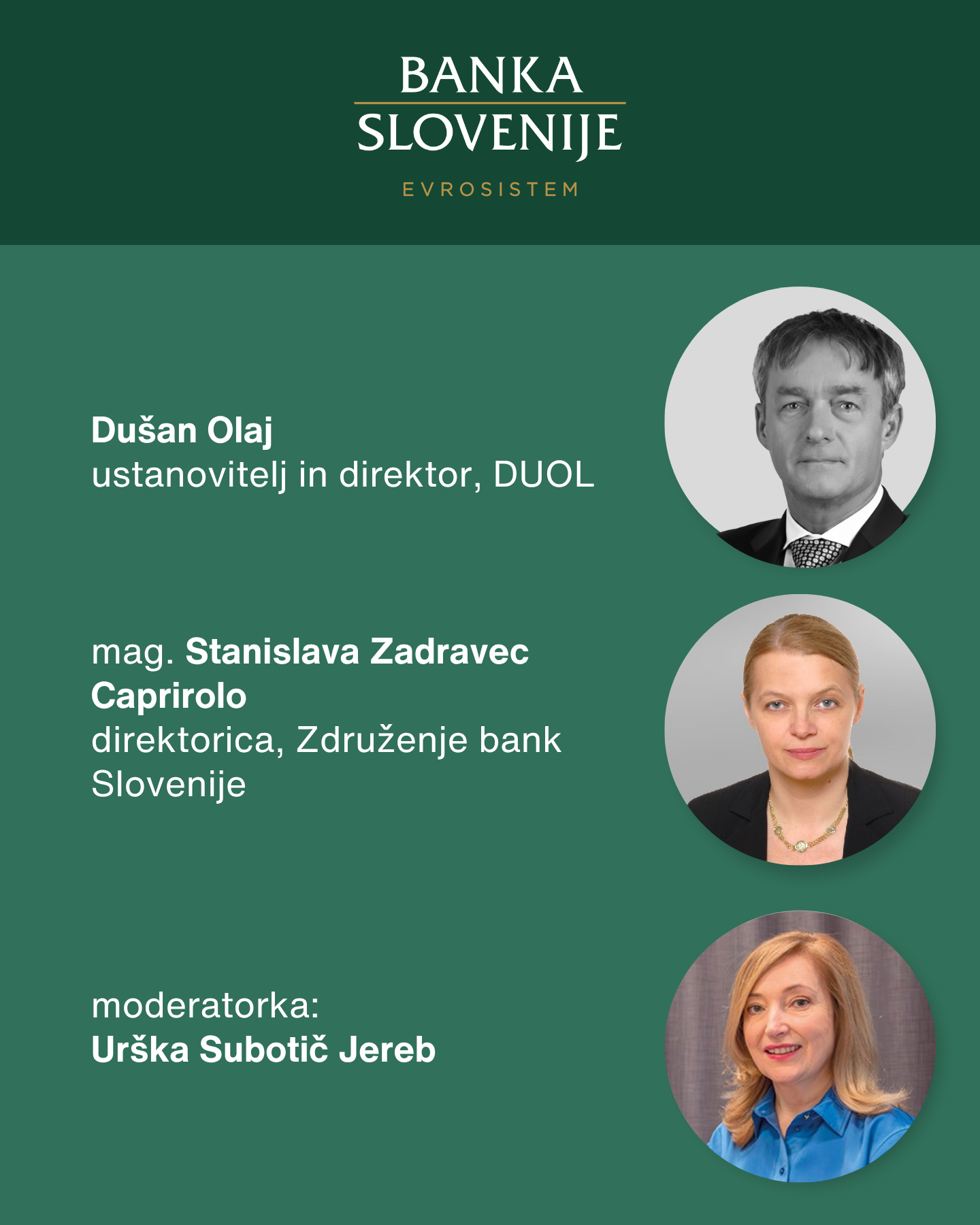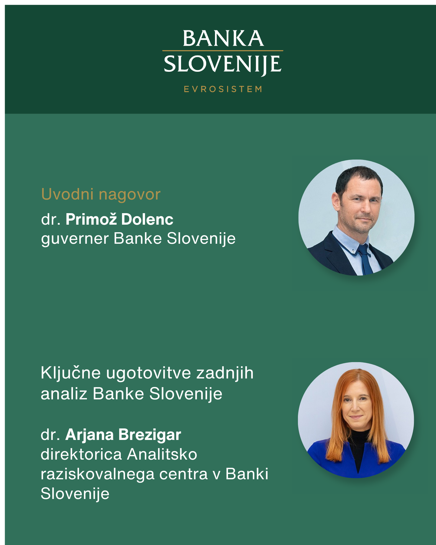 Udeležence bo najprej nagovoril guverner Banke Slovenije dr. Primož Dolenc. Ključne ugotovitve zadnjih analiz Banke Slovenije bo predstavila dr. Arjana Brezigar, direktorica Analitsko raziskovalnega centra v Banki Slovenije. Sledila bo okrogla miza, ki jo bo vodila Urška Subotič Jereb, novinarka v uredništvu gospodarskih oddaj Radia Slovenija. Na okrogli mizi bodo sodelovali še: