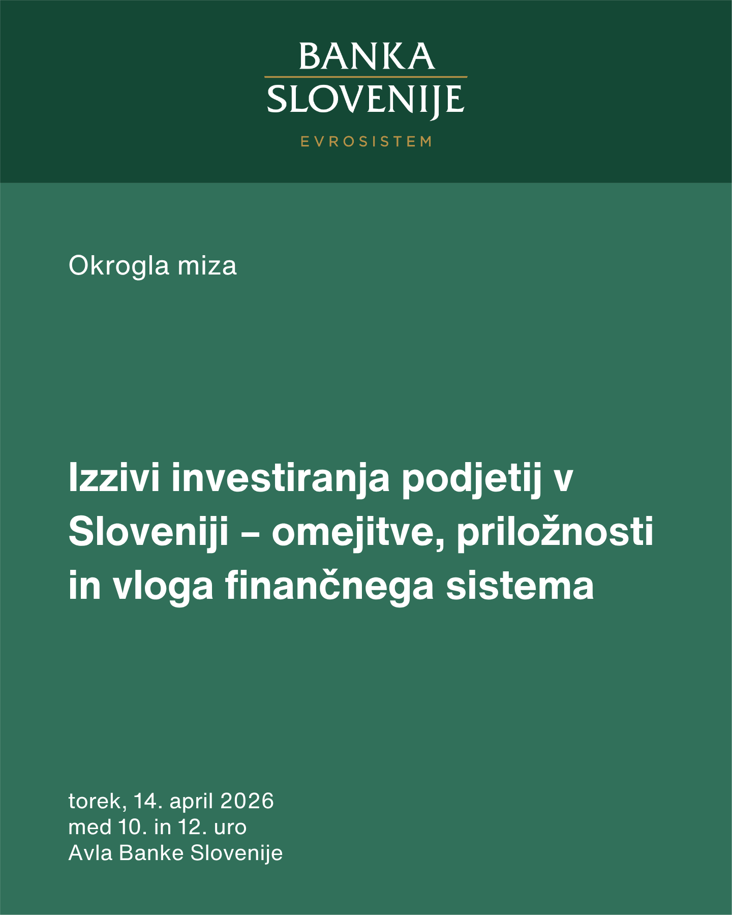 V želji, da obravnavano tematiko osvetlimo celovito in strokovno, v Banki Slovenije organiziramo okroglo mizo Izzivi investiranja podjetij v Sloveniji – omejitve, priložnosti in vloga finančnega sistema. Dogodek bo potekal v torek, 14. aprila 2026, med 10. in 12. uro, v avli Banke Slovenije.