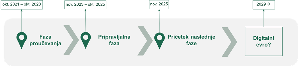 V Evrosistemu smo z analizo centralnobančnih digitalnih valut začeli leta 2017, od takrat pa se aktivnosti na tem področju stopnjujejo. Po objavi Poročila o digitalnem evru v letu 2020 smo izvedli javni posvet s strokovno in splošno javnostjo glede pričakovanih lastnosti in funkcionalnosti digitalnega evra. Julija 2021 je Svet ECB potrdil začetek dvoletne faze proučevanja projekta Digitalni evro, ki se je začela oktobra 2021 in je bila namenjena analizi potencialne zasnove digitalnega evra. Na podlagi zaključkov faze proučevanja je bila jeseni 2023 sprejeta odločitev o prehodu projekta v pripravljalno fazo, ki se je zaključila oktobra 2025. Tekom pripravljalne faze se je Evrosistem premaknil od teoretične zasnove k praktičnim aspektom digitalnega evra, kot so razvoj tehničnega pravilnika plačilne sheme in izbira razvijalcev tehnične rešitve digitalnega evra, pa tudi izvedba eksperimentov s tržnimi deležniki, podpora so-zakonodajalcema pri zakonodajnem procesu in raziskovanje umestitve digitalnega evra v evropski ekosistem plačil. S koncem pripravljalne faze je projekt Digitalni evro vstopil v naslednjo fazo, s katero želi Evrosistem zagotoviti pripravljenost na morebitno izdajo digitalnega evra v letu 2029, ob predpostavki, da bosta so-zakonodajalca pravno podlago za digitalni evro sprejela v letu 2026. Odločitev o izdaji digitalnega evra za zdaj sicer še ni bila sprejeta.