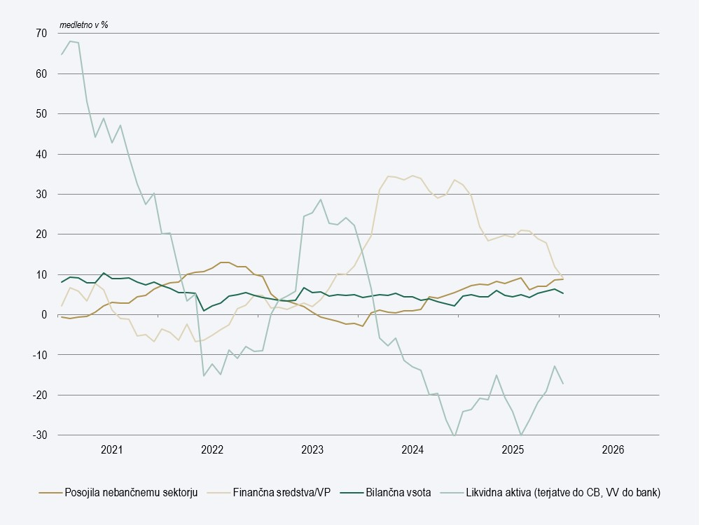 Januarja se je posojilna aktivnost slovenskih bank dodatno okrepila, pri čemer je medletna rast posojil nebančnemu sektorju dosegla 8,9 %. Najizrazitejšo krepitev obsega posojil so zabeležila posojila nefinančnim družbam. Posojila so še naprej namenjena predvsem financiranju obratnega kapitala. Visoka rast se nadaljuje tudi pri gospodinjstvih, saj rast stanovanjskih in potrošniških posojil v Sloveniji ostaja nad povprečjem evrskega območja.