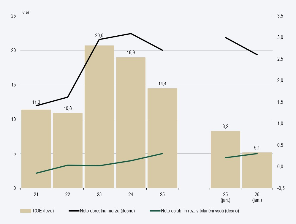 Donosnost na kapital (ROE), neto obrestna marža ter stroški oslabitev in rezervacij v bilančni vsoti