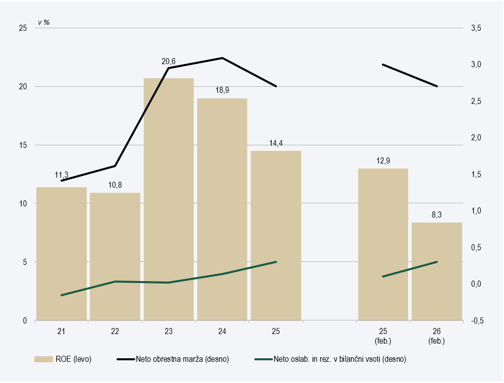 Opomba: Kazalnika neto obrestna marža na obrestonosno aktivo in neto stroški oslabitev in rezervacij na bilančno vsoto sta izračunana za zadnjih 12 mesecev. Donosnost na kapital (ROE) pred obdavčitvijo je znotraj leta izračunan kumulativno do vključno zadnjega razpoložljivega podatka.