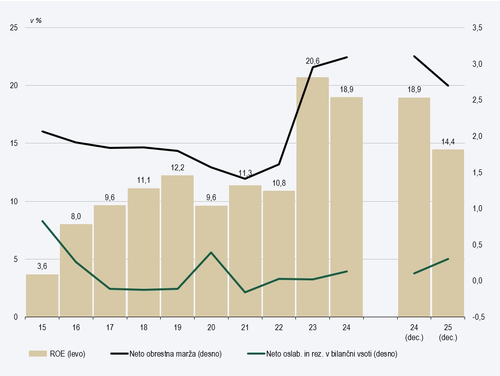 Banke so leto 2025 zaključile z 991 mio EUR dobička pred obdavčitvijo, kar je 17,4 % manj kot v letu 2024. Upad dobička je predvsem posledica nižjih obrestnih prihodkov, medtem ko so se neobrestni prihodki lani nekoliko povečali. Proti koncu leta so se nekoliko okrepile tudi neto oslabitve in rezervacije, ki pa glede na ustvarjeni dohodek ostajajo na nizki ravni. Donosnost na kapital je znašala 14,4 %, 4,5 odstotne točke manj kot v letu 2024, a ostaja nad dolgoletnim povprečjem.