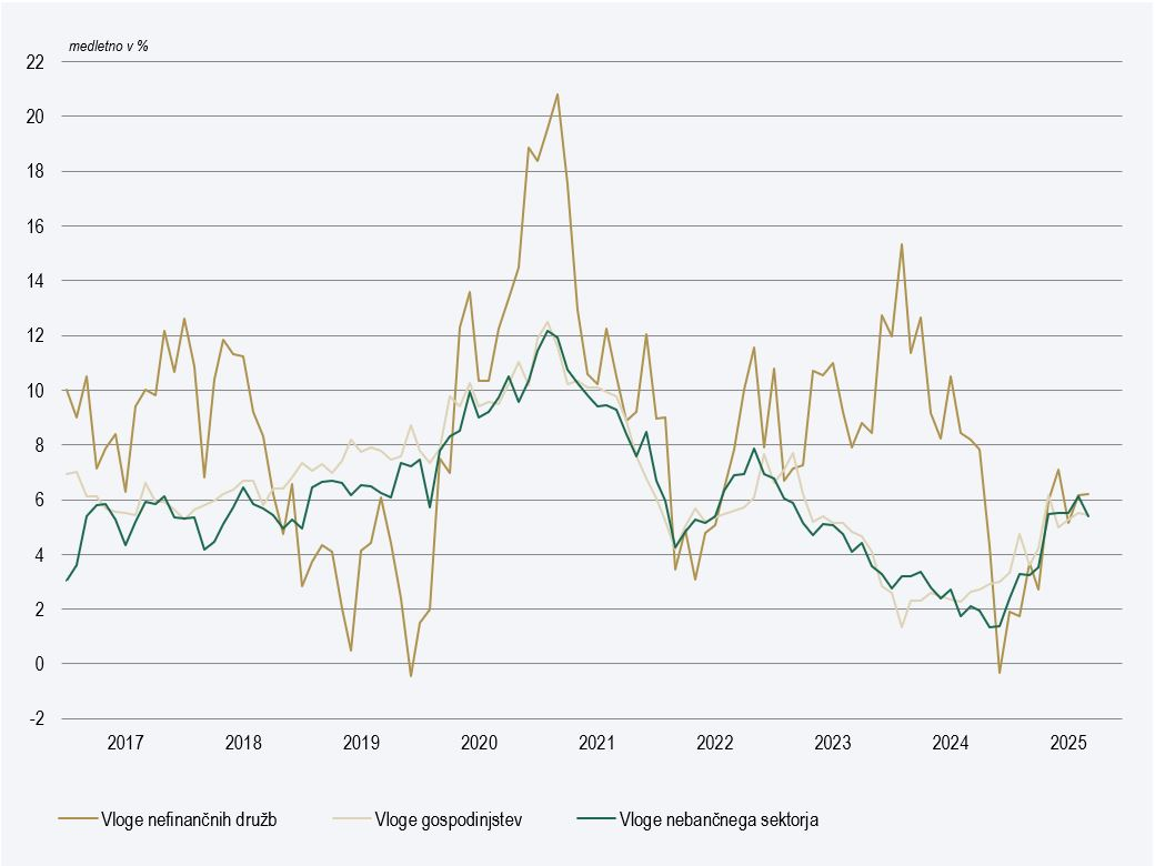 c) Obveznosti do neban. sekt. (vloge NS) | 23.892 | 45,9 | 41.625 | 76,7 | 43.292 | 76,9 | -115,0 | 1.667,4 | -0,3 | 5,4 |